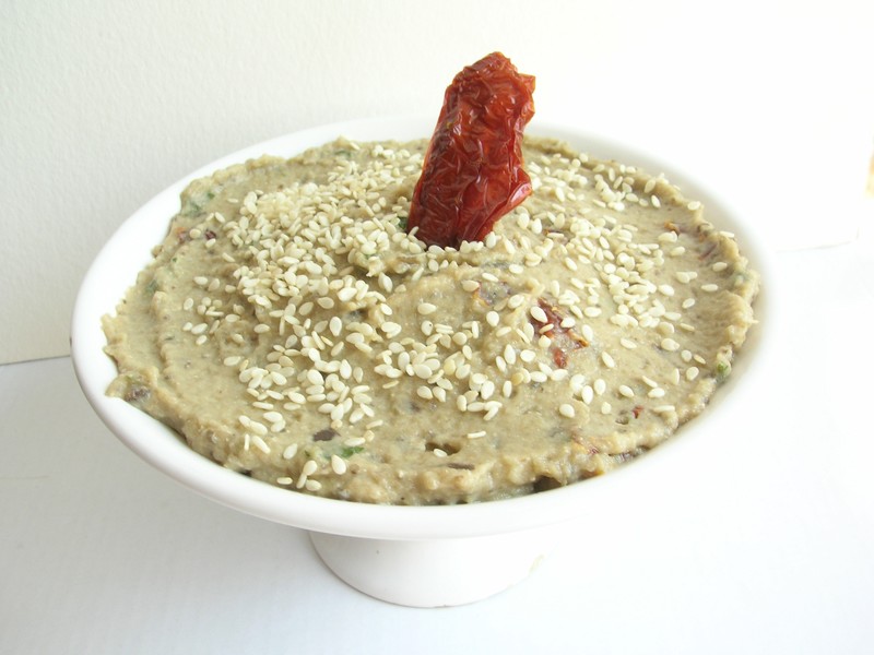 Ingrédients : 3 aubergines, 2 oignons, huile d’olive, ail, 30 cl de lait de soja, 2 g d’agar-agar, persil, dés de tomates séchées, sel, poivre.
