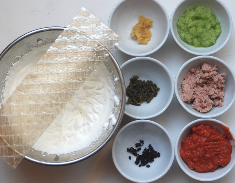 Ingrédients :3/4 tomates, ail, huile d’olives, thym, une demi-boîte de thon de 140 g égoutté, 1 concombre, 25 cl de crème fraîche liquide très froide, salicornes au vinaigre, citrons confits, olives noires hachées, 3 feuilles de gélatine de 2 g chacune, un peu de lait, sel, poivre