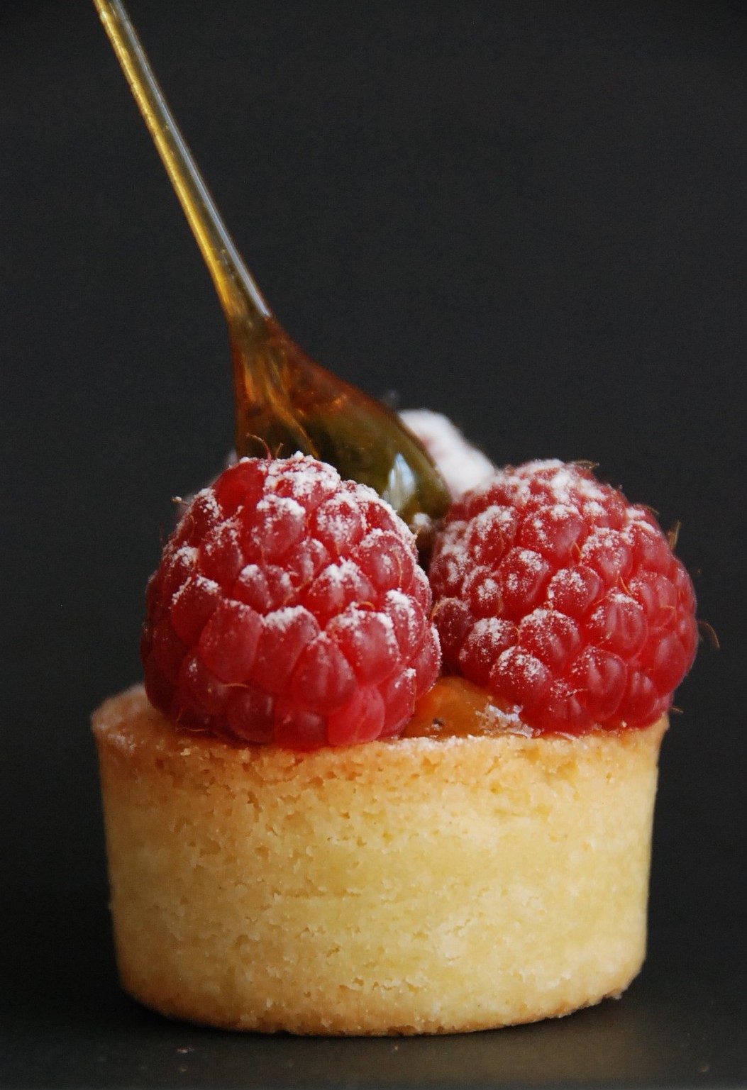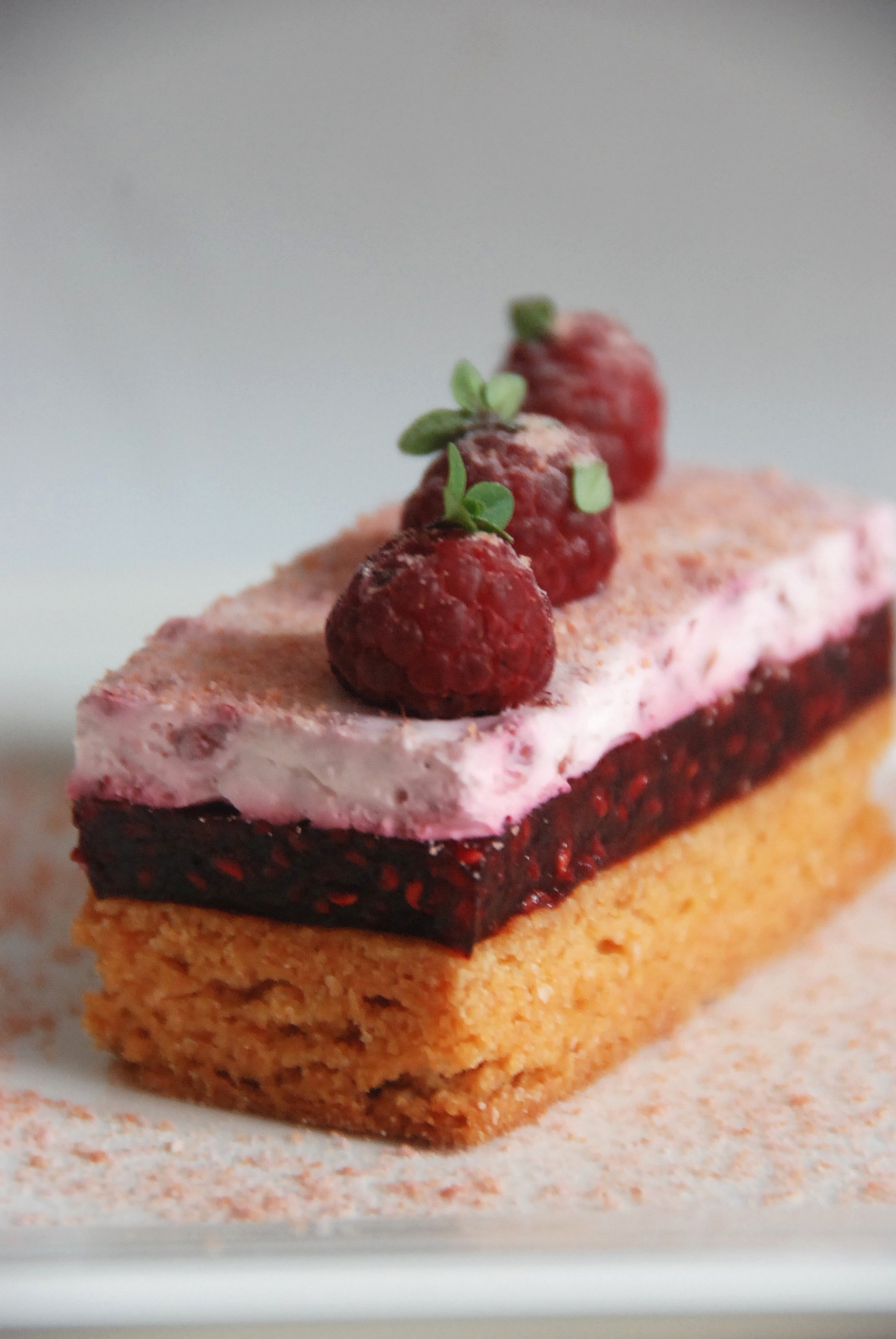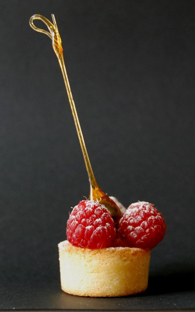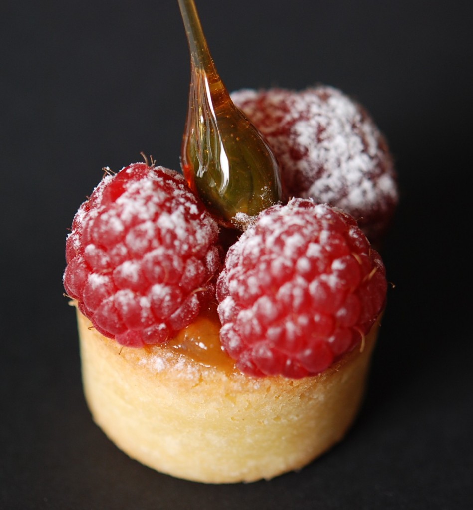 Mousse et gélifié de framboises sur sablé breton à la poudre de biscuits roses de Reims