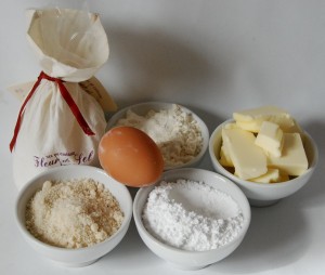 Ingrédients pour les tartelettes/sablés bretons (pour quinze petites tartelettes) : 62 g de farine, 90 g de beurre demi-sel très mou, 45 g de sucre glace, 1 jaune d’oeuf (20 g), 40 g de poudre d’amande, 1 pincée de fleur de sel
