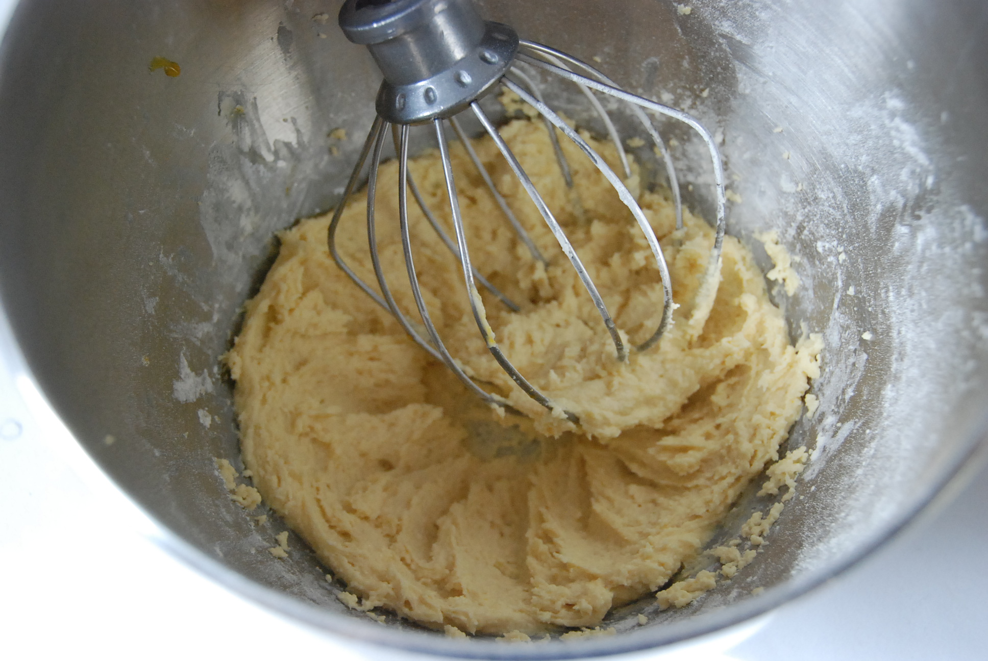 Dans la cuve du robot, mettre le sucre glace, la poudre d’amande et le beurre mou. Battre à vitesse moyenne puis ajouter le jaune d’oeuf, la farine et la fleur de sel. Battre à nouveau à grande vitesse pendant quelques instants.