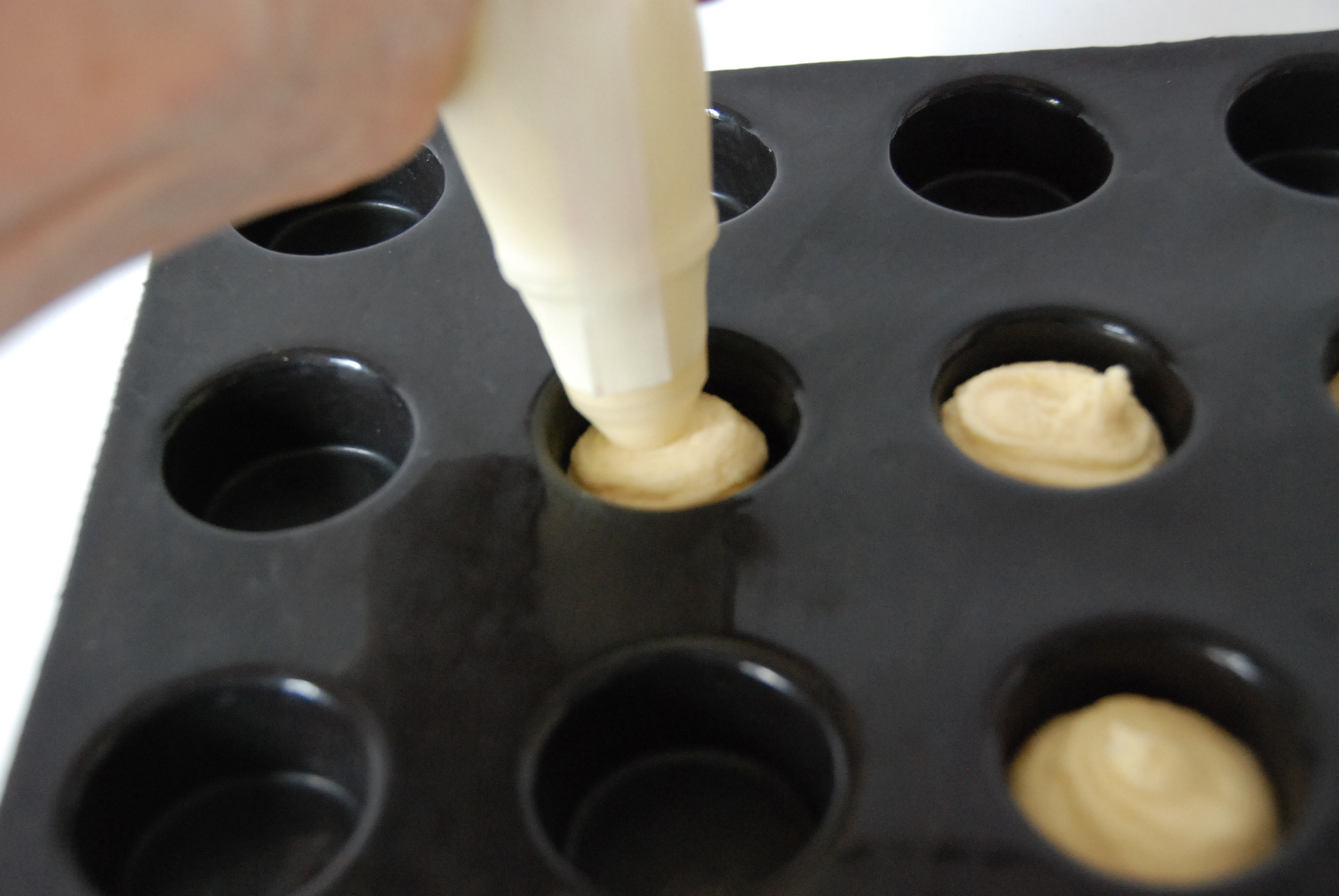 Avec une poche à douille, emplir les empreintes Flexipan®, ici petits cylindres.