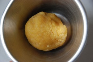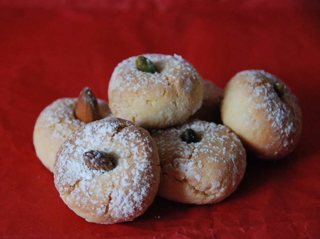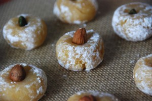Pour rester dans l’ambiance, un essai de ghoribas. Cela ressemble un peu à la farce pour les cornes de gazelle à laquelle on aurait rajouté un oeuf.