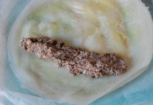 et enrouler les feuilles de brick autour de la farce pour former un rouleau en ayant soin de rabattre les extrémités vers l’intérieur.