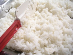 On étale alors le riz dans un plat rectangulaire et avec la maryse, on le “coupe” pour le faire refroidir le plus vite possible.
