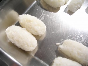 Préparer un bol d’eau froide. Tremper ses mains dans l’eau froide puis prendre une boule de riz et la mettre en forme.