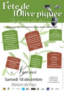 Autre actualité : ce dimanche 18 décembre aura lieu à Nyons La fête de l’olive piquée, organisée par le Syndicat de l’Olive Noire de Nyons, l’Association Française Interprofessionnelle de l’Olive..