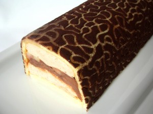 Verdict : évidemment, je n’ai pas retrouvé le goût de ce que j’avais dégusté, mais le résultat est honorable. Une prochaine fois, j’utiliserai un insert de plus grande taille occupant presque la totalité de la largeur de la bûche (par exemple moule bûchette Demarle) et il me faut revoir la composition de cet insert, je souhaitais une autre texture, plus moelleuse.