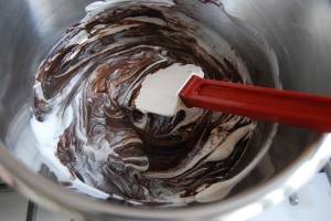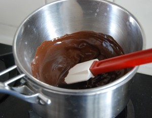 Faire bouillir la crème. Réaliser une ganache : verser en 3 fois la crème bouillante sur le chocolat.
