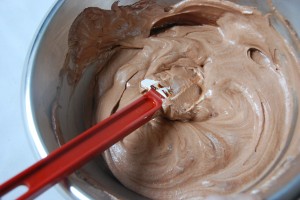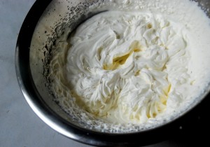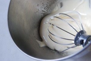 Monter la crème au batteur (fouet) à moyenne vitesse jusqu’à consistance ferme et la réserver au froid dans un cul de poule. Elle doit être mousseuse.