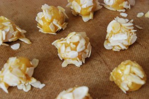 Sortir la pâte du réfrigérateur. Former des boules. Les rouler dans les jaunes d’oeufs puis dans les amandes.