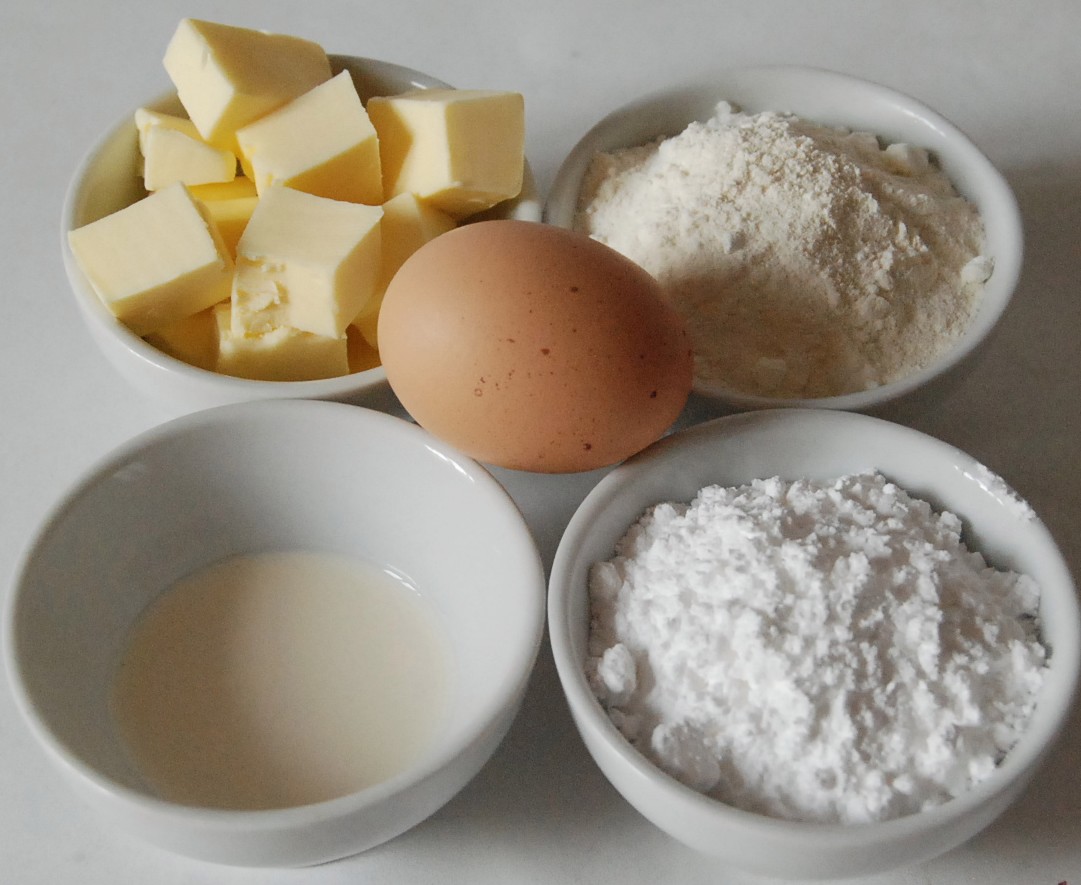 Ingrédients pour la pâte sablée pochée : 150g de beurre pommade, 100g de sucre glace, 1 œuf entier, 15g de crème liquide entière, 200g de farine, 20g de fécule de maïs, 1 pincée de sel, vanille en poudre