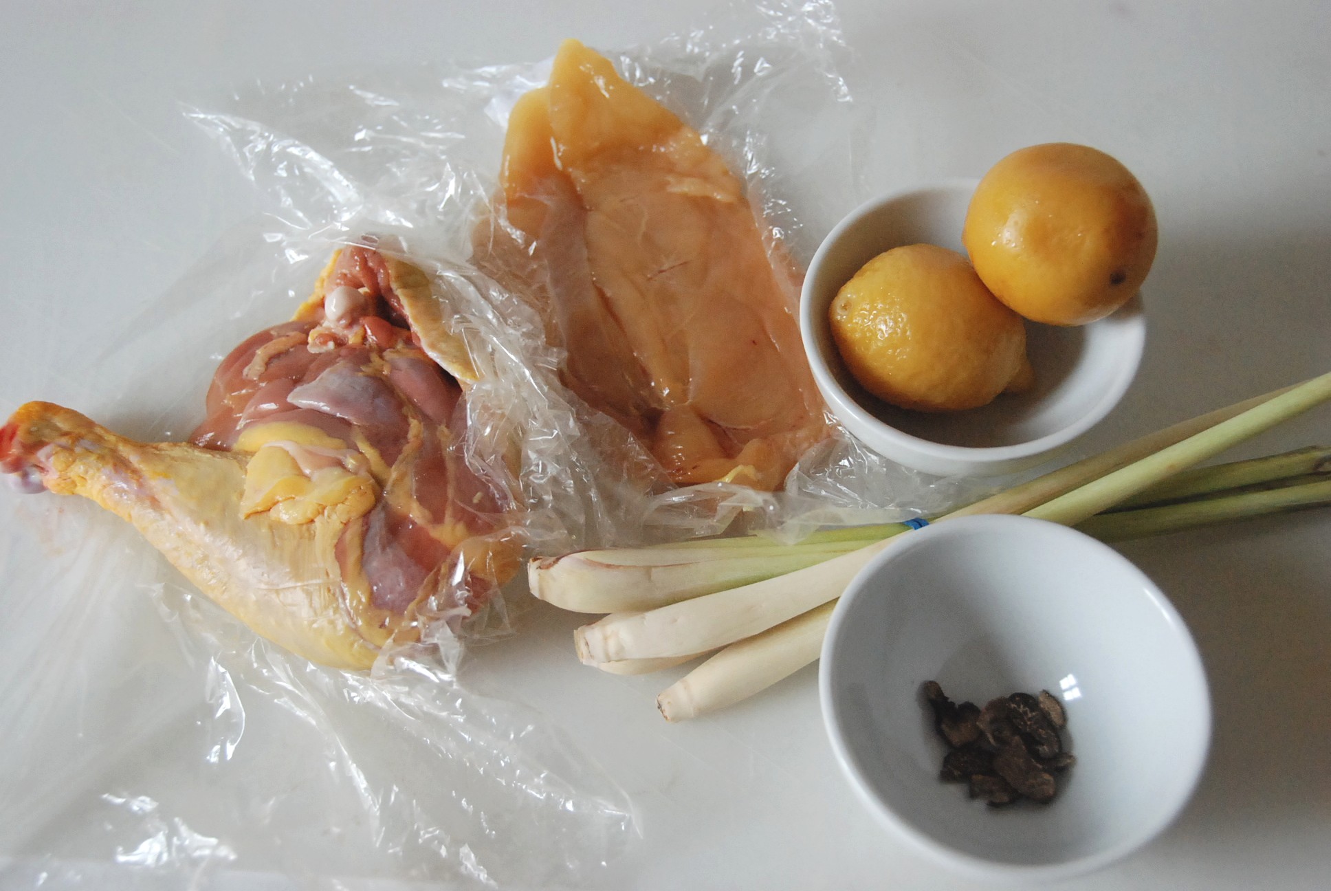Ingrédients pour le fond blanc à la citronnelle et mélisse : os, abattis, oignon, tiges de citronnelle, feuilles de mélisse