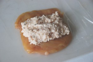 Ouvrir les filets de poulet. Mouiller le plan de travail (cela fixe le film alimentaire). Disposer un rectangle de film alimentaire. Mettre un peu de poivre. Placer les filets et recouvrir d’une couche de film alimentaire. Aplatir.