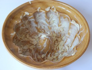 Beurrer le moule et mettre au réfrigérateur quelques instants. Saupoudrer d’amandes effilées.