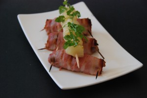 J’ai choisi une farce d’agneau aux épices enroulée dans du lard, accompagné de poires et le tout passé au grill.