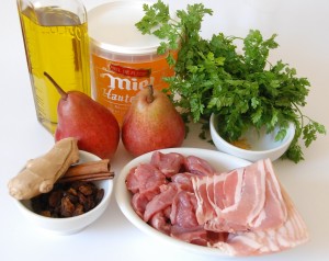 Ingrédients pour 3 portions : 10 tranches fines de lard, 150 g d’agneau haché, 1 échalotte, gingembre frais, bâton de cannelle, QS (quantité suffisante) miel, raisins secs, poire, coriandre, huile d’olive, zestes d’orange