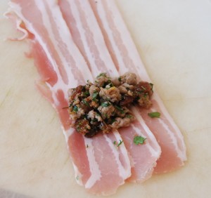 Etaler 3 tranches de lard en les faisant se chevaucher. Poser la farce dessus.