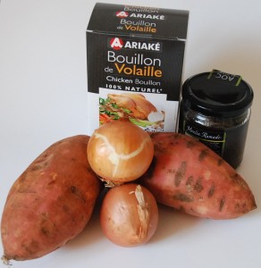 Ingrédients : 1 patate douce, 2 oignons, huile d’olive, tapenade noire, 1 sachet de bouillon de volailles Ariaké
