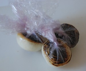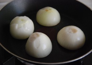 Faire chauffer une poêle à sec. Eplucher les oignons. Les couper en deux et les poser sur la poêle pour les faire “brûler”.