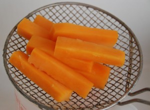 Pendant ce temps, faire dorer les frites dans une poêle contenant de l’huile d’olive.