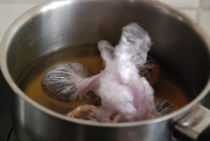 Enlever les oignons et garder le bouillon qu’on fait réduire.