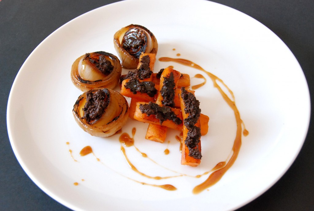 Un accompagnement à la fois doux (patate douce) et corsé (tapenade et réduction de bouillon), utilisant une fois de plus les célèbres bouillons Ariaké (déjà utilisés ces jours-ci avec le potage aux glaçons de légumes).