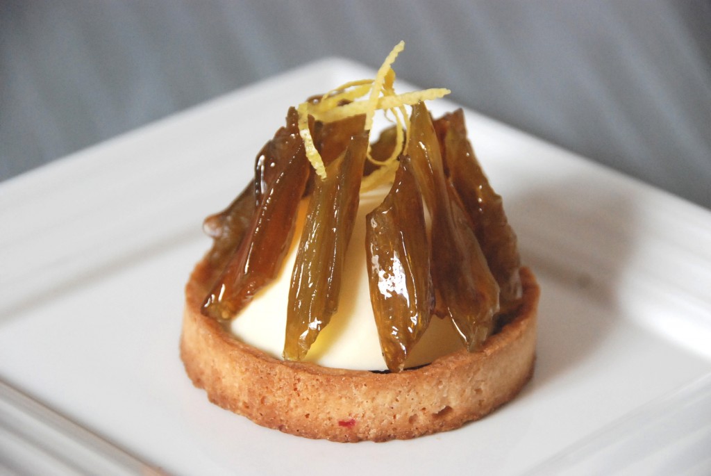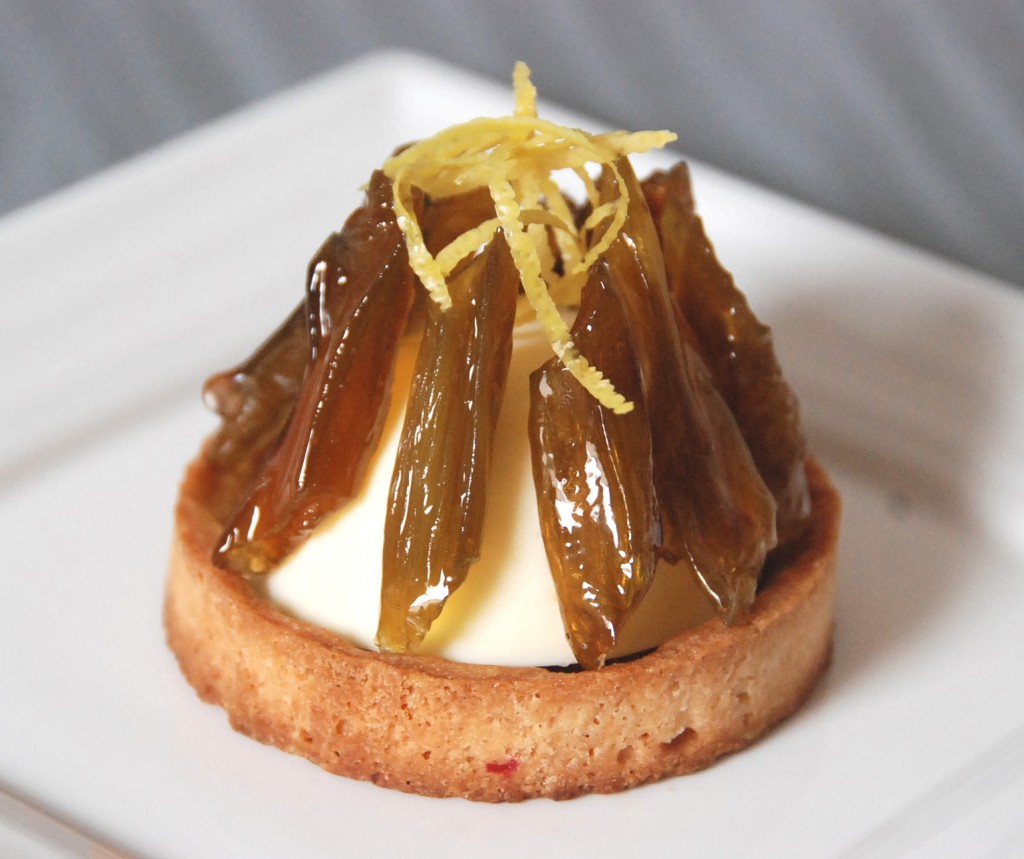 Ajouter des filaments de zeste de citron. C’est très frais et la rhubarbe confite compense l’acidité du citron.