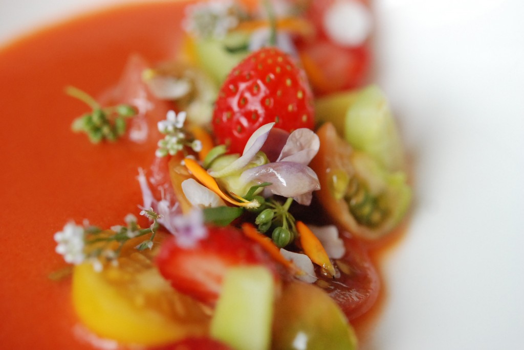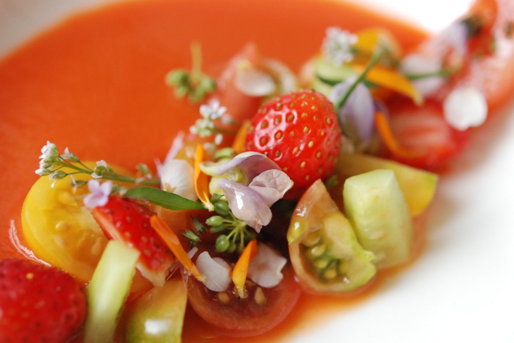 Ingrédients : toutes sortes de tomates, oignon, toutes sortes d’herbes et de fleurs, concombre (du marché), fraises, huile de sésame, jus de yuzu, sel