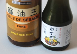 Mélanger huile de sésame, jus de yuzu et sel pour l’assaisonnement. Verser sur les légumes et mélanger délicatement.