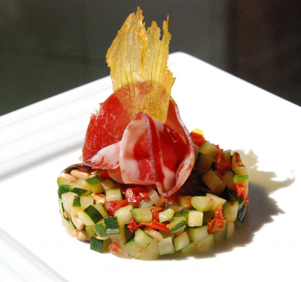 Tartare de courgettes, tomates confites et coppa, chips de fleurs de courgette cf O. Da Silva