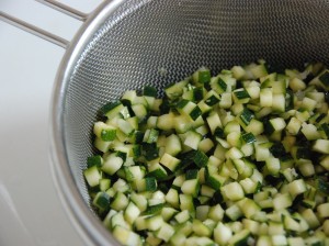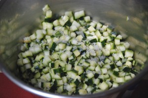 Laver les courgettes. Les couper en brunoise (petits dés) et les placer dans un cul de poule. Asperger de gros sel.