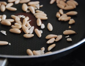 Placer les dés de courgettes dans un cul de poule. Ajouter la ciboulette ciselée, des petits morceaux de tomates confites, de petits morceaux de parmesan, un peu de vinaigre balsamique blanc et les pignons. Mélanger.