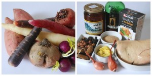 Ingrédients (on peut diviser les proportions par 2) : 2 patates douces moyennes, 500 g de carottes (violettes, jaunes), 1 betterave chioggia, quelques radis japonais, 50 cl graisse de canard, 2 échalotes moyennes, 1 foie gras cru déveiné, mélange 5 épices, poivre, sel, 1 verre de porto, 2 grands carrés de pâte feuilletée pur beurre, QS (quantité suffisante)  de sucre blanc, 4 abricots secs, 50 g raisins secs, 4 figues fraîches ou figues sèches, 25 cl de miel liquide, 25 cl de bouillon de volaille, noisettes entières hachées, jeunes pousses, fleurs comestibles, graines germées