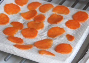 Mettre à chauffer une grande casserole d’eau avec 1 cuiller à café  de sel. Eplucher les légumes. Détailler à la mandoline de fines rondelles de patates douces, réserver.Faire blanchir les rondelles de patate douce. Les réserver sur du papier absorbant. Avec un emporte pièce de  3cm, découper des cercles.