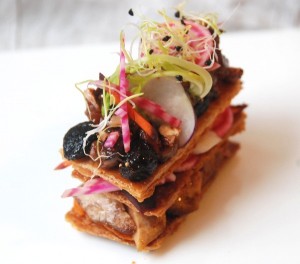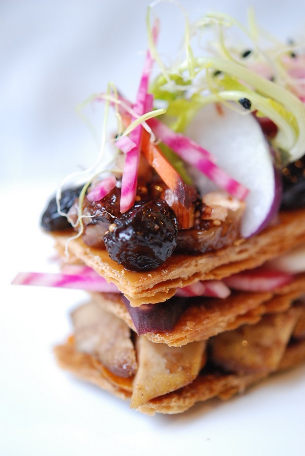 Mille feuilles de foie gras, fruits secs, épices et légumes racines