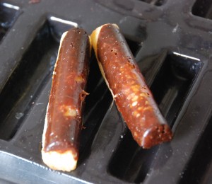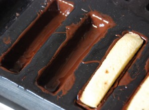 Faire fondre le chocolat au bain-marie. Avec un pinceau, garnir chaque empreinte et déposer aussitôt les fingers enrobés de caramel froid dans les empreintes afin de réaliser l’enrobage au chocolat.
