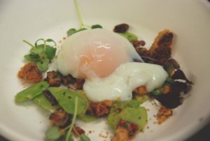 Un oeuf parfait (cuit au four 40 mn à 63°C), avec crumble de chorizo et shiso. Cuit à basse température, l’oeuf parfait est plus tendre et plus onctueux qu’un oeuf dur, plus ferme qu’un oeuf mollet. Son blanc est tremblant et soyeux tandis que son jaune affiche un crémeux coulant.