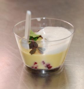 Une verrine avec crème de maïs, brunoise de betterave rouge et de mangue, oxalis et espuma de cardamome