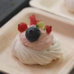 pavlova avec dés de concombre, chantilly au coquelicot et fruits rouges