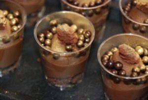 verrines avec ganache au chocolat noisettes, riz soufflé, crumble cacao, grué de cacao et or alimentaire.