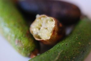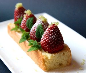 Couper des tranches et disposer des fraises. Ajouter quelques grains de citron caviar pour un peu de fraîcheur.