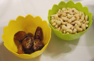 Elle nous a préparé une délicieuse boisson à base de dattes (10), noix de cajou (5 poignées) et eau que l’on mixe pour obtenir un jus (on ne dit plus “lait”) végétal.