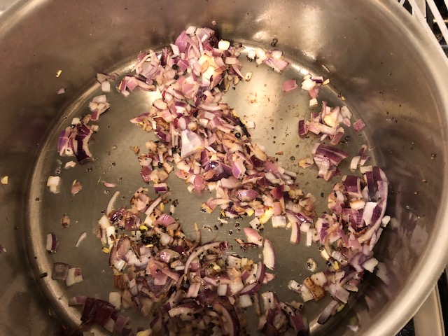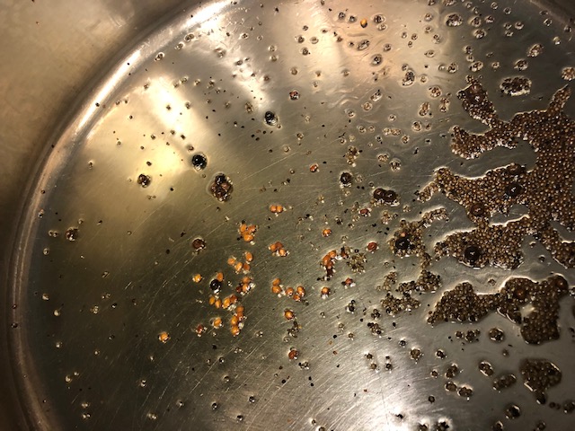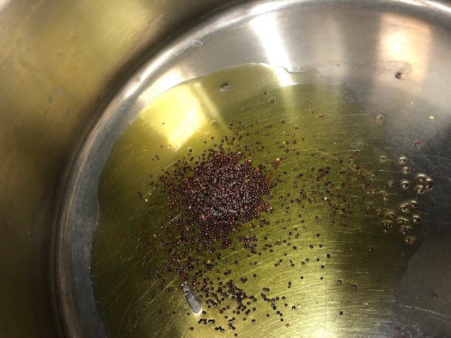 dans laquelle on fait revenir quelques graines de moutarde noire, quelques grains de poivre puis lorsqu’elles auront crépité, le fenugrec.