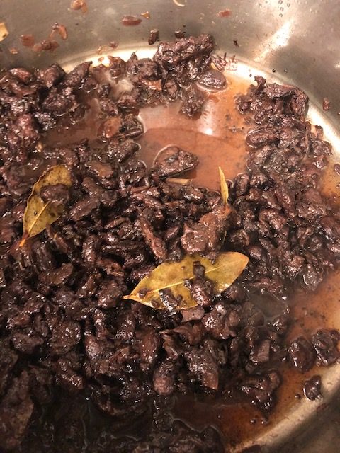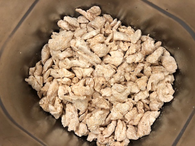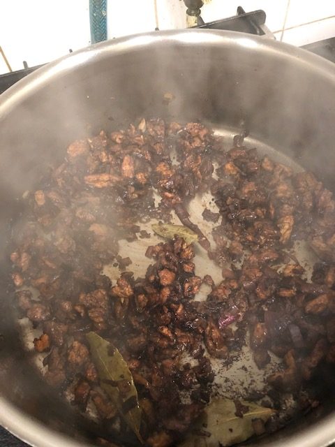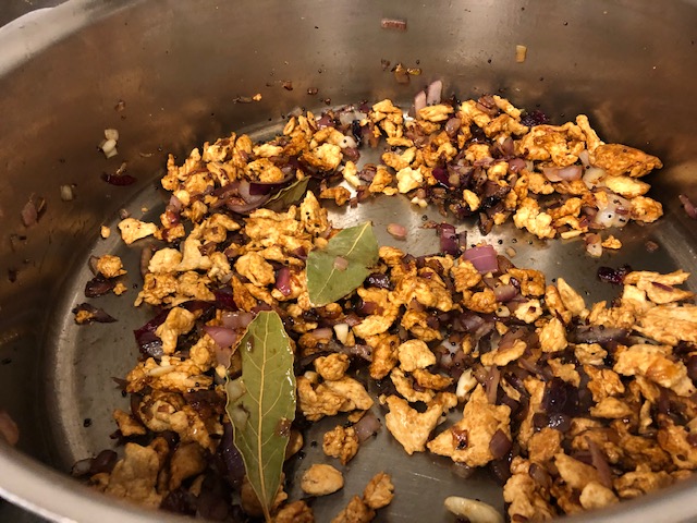 Ingrédients : protéines de soja (20 g sec par personne), graines de moutarde, huile de coco, fenugrec, oignon émincé, quelques grains de poivre, ail écrasé, sauce soja, feuilles de laurier, vin