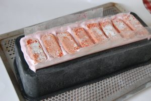 Continuer à verser la mousse. Disposer les biscuits roses de Reims (j’ai légèrement retaillé les biscuits pour qu’ils soient bien rectangulaires) pour faire le socle de biscuit.