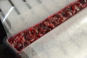 Ingrédients pour le gélifié de cranberries : 300 g de cranberries fraîches, 250 g de sucre, 3 feuilles de gélatine